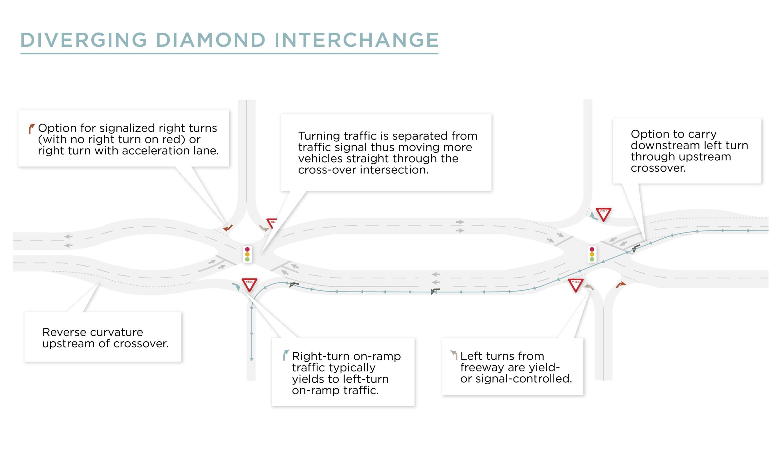 A fresh concept in interchange design, known as a Diverging Diamond Interchange (DDI) or Double Crossover Diamond Interchange, takes traffic safety and efficiency to a new level. In a traditional diamond interchange, approximately 26 conflict points can lead to traffic crashes. DDIs have just 14 conflict points. Fewer conflict points mean fewer vehicle opportunities to collide, resulting in a safer, more efficient traffic flow.