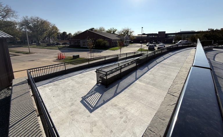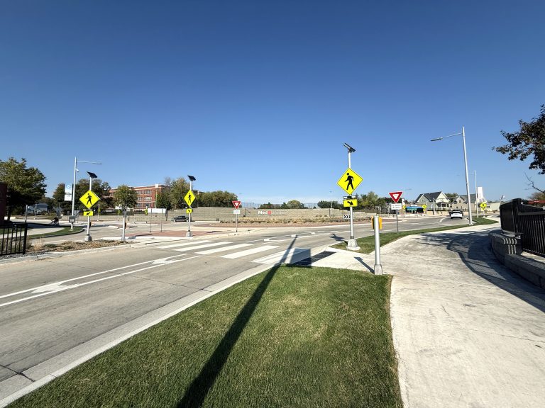 Pedestrian safety features include Rectangular Rapid Flashing Beacons (RRFBs), splitter islands, and refuge zones that allow pedestrians to cross only two lanes at a time. The outdated pedestrian bridge east of the intersection was removed and replaced with ADA-compliant, ground-level crossings, aligning with Cedar Rapids’ multimodal transportation vision.