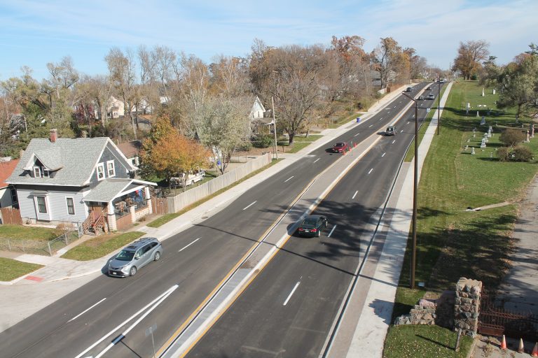 To achieve the required vertical clearance for the new Mercy Hospital skywalk, engineers designed a reinforced concrete arch pipe system with a cast-in-place cap that provided sufficient stormwater capacity beneath the roadway without raising the street profile. Both the reconstruction and rehabilitation segments incorporated geogrid reinforcement to strengthen the pavement while reducing excavation and backfill needs. In the rehabilitation zone, an asphalt interlayer was used to prevent reflective cracking and extend pavement life.