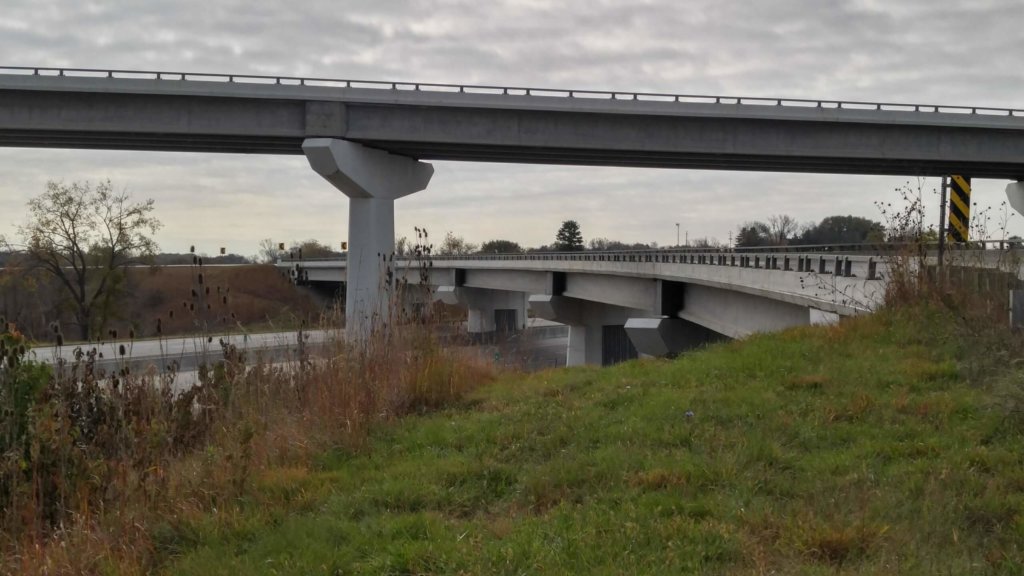 One of the final features to be constructed as part of a decades long beltway project around the southern side of the Des Moines metro area was the new interchange at the junction of Interstate 35 and Iowa Highway 5. Years in the making, the freeway bypass was built to decrease travel times in and around the Des Moines area, improve safety, address anticipated future congestion, and increase accessibility to existing and proposed development areas along the corridor. The two bridges designed by Shuck-Britson (a subsidiary of Snyder & Associates) are the focal point of the interchange.