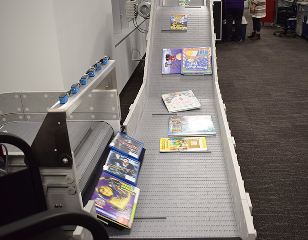 An automated material handler reduces the amount of staff time needed to sort books before returning them to the shelves.