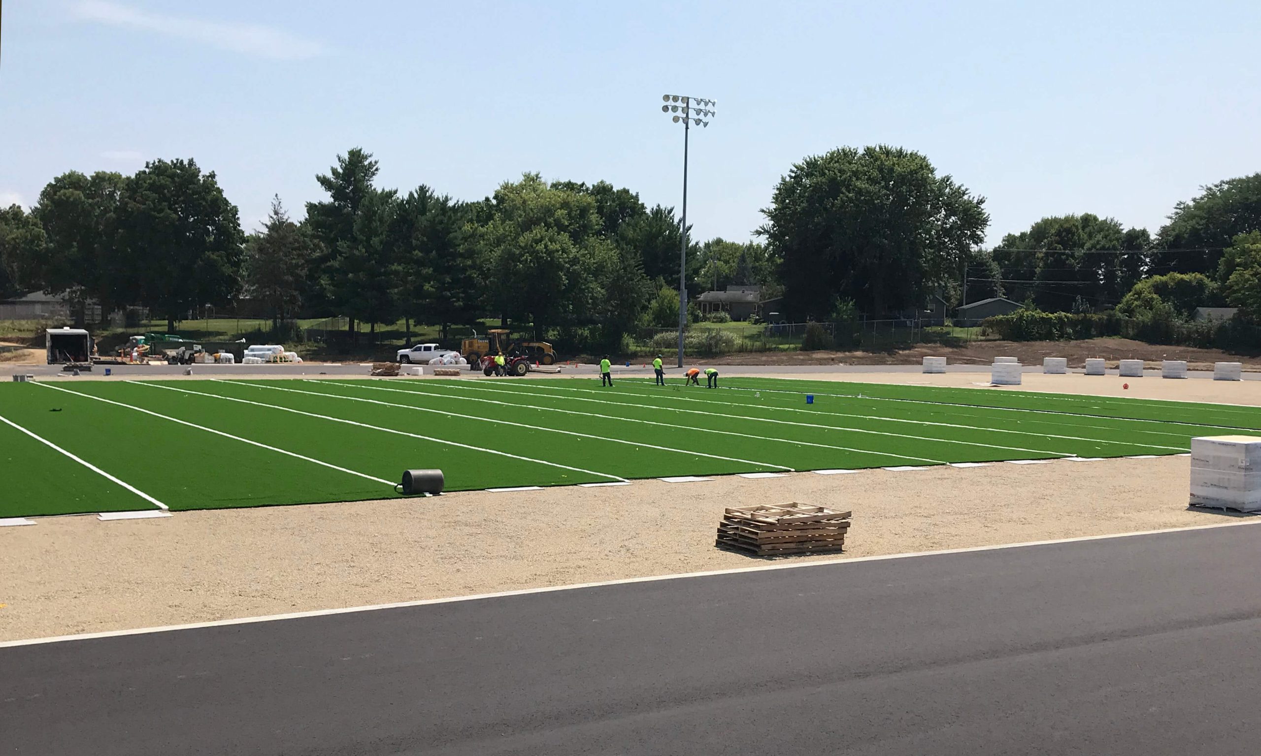 Renovation plans included improvements to the district’s sports venues. The McFarland High School stadium had the natural turf field replaced with a synthetic turf field, while the running track around the field was reconstructed and shifted slightly to allow space for the school building expansion. Synthetic turf withstands frequent use better than natural grass, which is important as the football field also accommodates other athletic school functions. A key component of the athletic field design is a rock and drain tile subbase that promotes better drainage during heavy rain events.