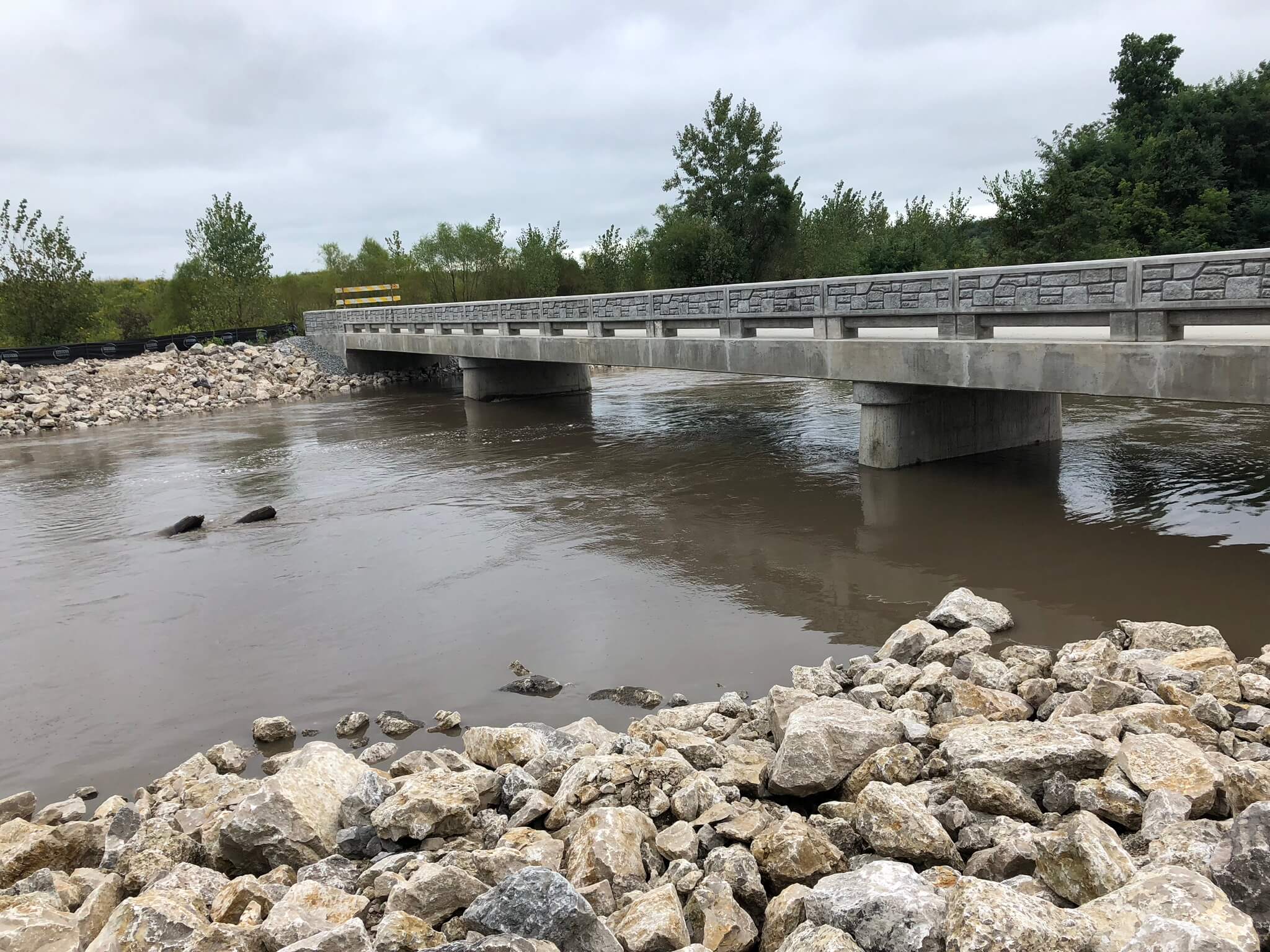 Aerial rendering of the Grand Avenue roadway extension in West Des Moines|Map of National Flood Hazard Layer of the project area|Image of construction taking place for Grand Avenue extension in West Des Moines Iowa with construction workers and cement trucks in the background|Newly poured roadway with road crew working in the background.|Image of construction taking place for grand avenue extension in West Des Moines Iowa|New bridge over Johnson Creek with earthwork still to complete underneath.|View of the Johnson Creek Bridge along Grand Avenue with the new monuments installed on either side.|Custom-designed monuments for the City of West Des Moines