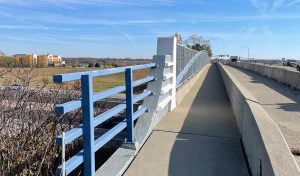 An arched steel frame and mesh panel pedestrian railing borders the sidewalk along the north side of the bridge.
