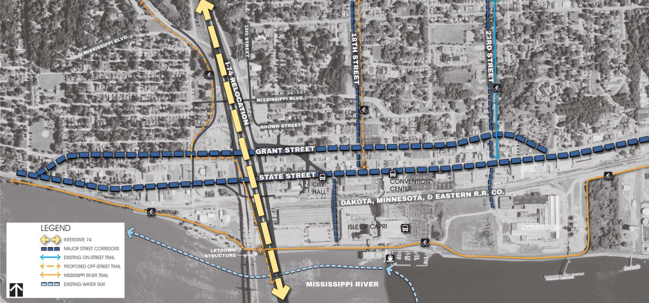 Another goal of the study was to find a way to provide better connectivity from downtown to the riverfront. Currently, the Canadian Pacific Railroad tracks run parallel to State Street to the south and divide the two districts. A single overpass at 17th Street is the only grade-separated crossing that provides uninterrupted access to venues south of the tracks, including the casino, regional trail system, and the riverfront. Locating another access to the riverfront would link a network of entertainment destinations and services to help attract visitors and residents.