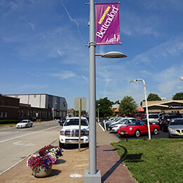 Street lightpole with purple welcome banner