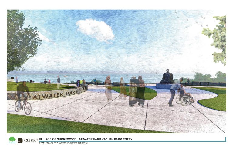 Perched atop a bluff 100 feet above the shores of Lake Michigan, Atwater Park is one of Shorewood’s most iconic civic spaces. Serving as a passive park, community gathering spot, and direct connection to the lakefront, the park embodies both the Village’s heritage and its recreational future. The Village of Shorewood partnered with Snyder & Associates to develop a master plan that addressed failing hardscape surfaces, deteriorating landscapes, and the long-term circulation challenges for both maintenance vehicles and pedestrians.