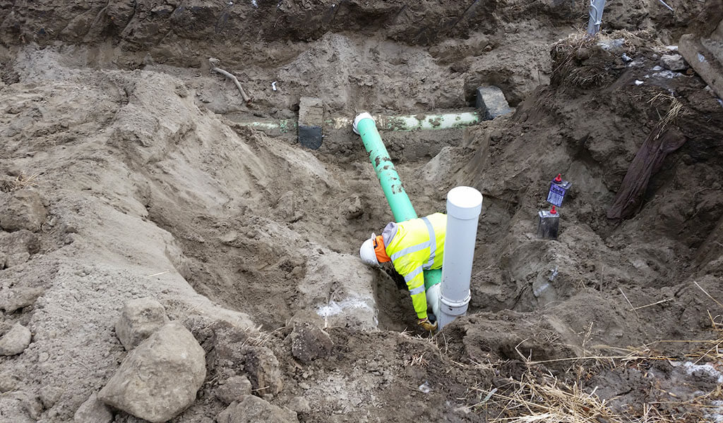 Leachate Disposal Lift Station at Des Moines County Landfill|excavator digging trench for sewer force main|Leachate Disposal Submersible Wet Well Lift Station|Leachate Disposal Construction of Force Main|Leachate Disposal Wastewater force main Cleanout