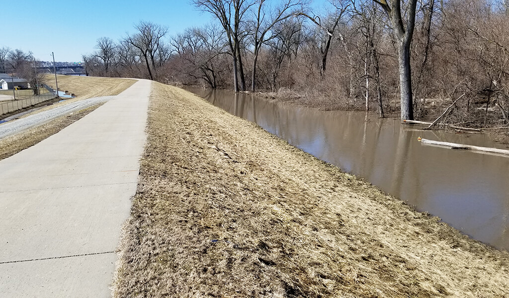 Levees are an important component of community infrastructure in Council Bluffs, Iowa. Located near streams and rivers, these embankments reduce flood risk. The Council Bluff levee system spans over 28 miles, helping to protect more than 35,500 people and 11,700 buildings. Without levees, over 60 percent of Council Bluffs would be at a higher risk of flooding from the Missouri River.