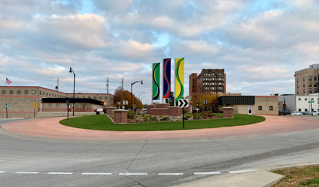 Along with the roadway improvements, our team also coordinated the addition of gateway features at both roundabout locations to enhance the corridor’s aesthetic character further. At the 1st Avenue South and South 6th Street roundabout, our team developed plans for installing metal banners affixed to tall poles. These decorative metal banners were chosen for their attractiveness and durability. The banners can also be easily changed for seasonal displays or special promotions.