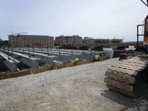 The engineering team also added beamlines under the raised pedestrian sidewalk to support a snooper truck for future under-bridge inspections and maintenance. The additional sidewalk load resulted in nonuniform beam reactions requiring careful analysis to determine the proper reinforcing strand and shear stirrup patterns, as well as bearing pad sizes. Further, more than 30 separate utility conduits were incorporated into or below the new bridge deck.