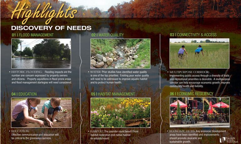 A site analysis and needs assessment helped guide the decision-making process for greenway requirements and boundaries. It included an inventory of existing site conditions, along with a review of the past and current planning efforts of nearby communities. This helped identify how a greenway system can help guide commercial growth and serve as an asset for local businesses while achieving the main objectives of flood hazard mitigation and water quality improvement.