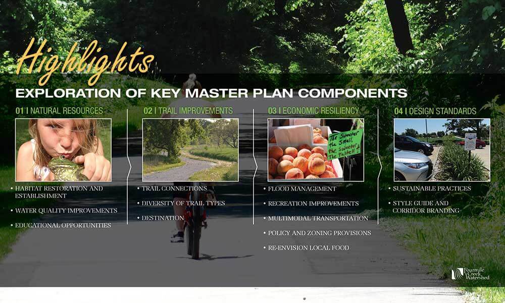 Lower Fourmile Creek is located in the bottom one-third of the Fourmile Creek Watershed, which encompasses 76,000 acres of south-central Iowa. The Lower Fourmile Creek Greenway Master Plan is one of the first steps to implementing the vision set forth by the Fourmile Creek Watershed Management Plan. It addresses critical greenway components and identifies the potential recreational and educational amenities a greenway system can provide.