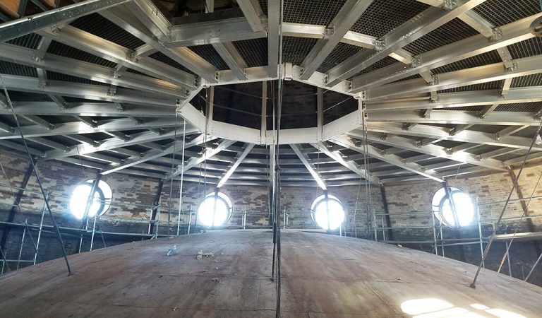 Near the top of the dome, an attic separator consisting of a cellular metal deck, steel beams, and tie rods separates the upper dome from the building. To control the moisture levels and temperature, a rubber membrane was added to the attic separator to help mitigate the possibility of future moisture damage. This separator and membrane create a thermal barrier between the dome and the building. To access this space for future maintenance, a monitoring platform constructed from lightweight aluminum and fiberglass grating was added to the structural design.