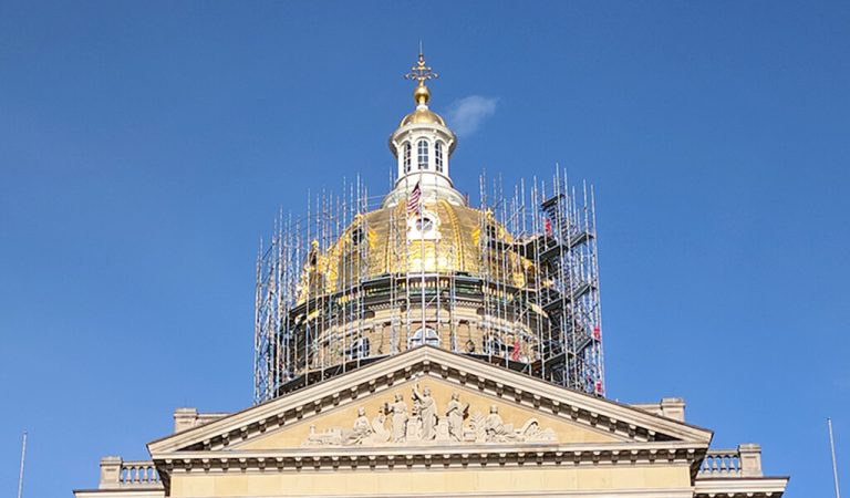 Defining the Des Moines skyline since 1886, the Iowa State Capitol Building is one of the nation’s most iconic statehouses. The Renaissance-style, rectangular structure has a commanding, gold dome in the center, fortified with four smaller domes at each corner of the building. Reaching a height of 275 feet above the ground floor, the central dome is constructed of iron and brick and is covered in 23-carat, gold-leaf gilding. The tissue-paper thin sheets are covered with a protective layer to seal them from the elements.