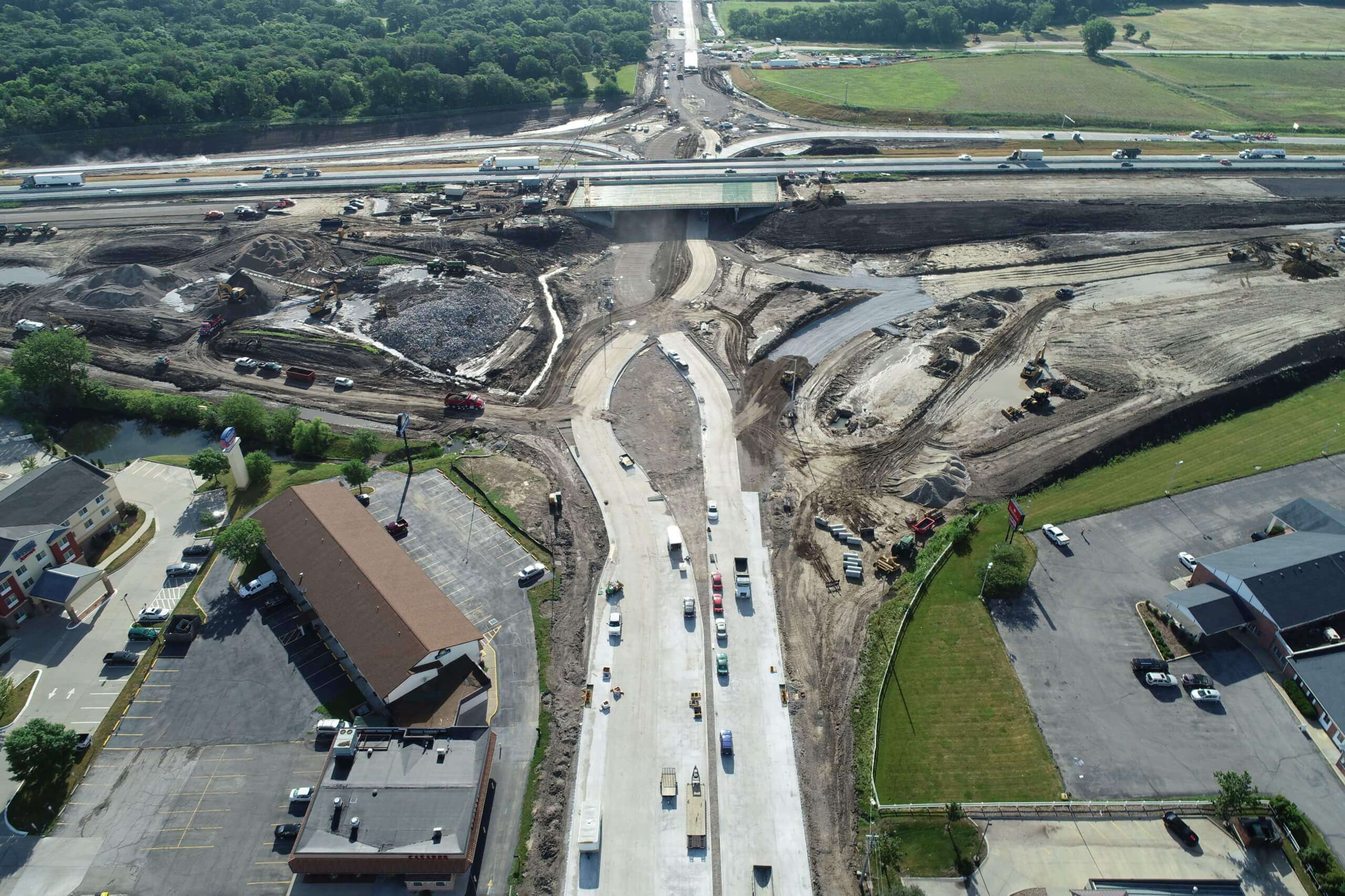 The Snyder & Associates team served as the primary design consultant for roadway and interchange ramp improvements, while our subsidiary Shuck-Britson, Inc., handled the lead structural design for all bridges and box culverts associated with the project. Snyder & Associates also facilitated coordination with utility owners and developed the required platting and necessary permits. Our team contracted with Terracon, Inc. to complete all geotechnical engineering. During construction, a detailed staging plan was implemented to reduce traffic disruption and complex detours, while also maintaining the safety of the public and contractors.