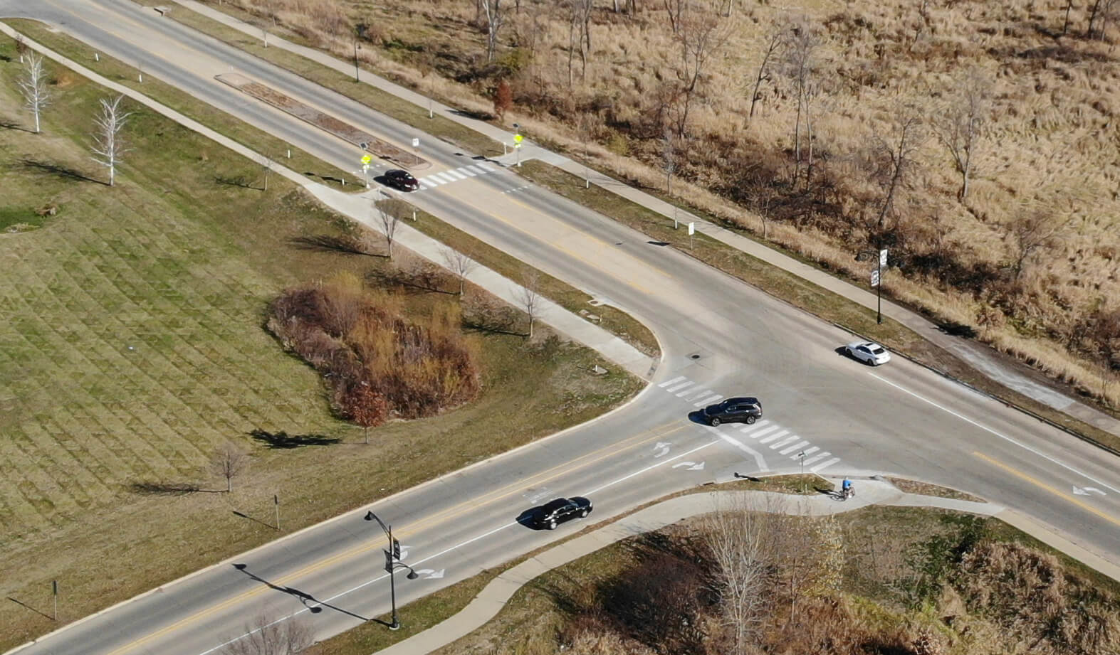 One area that required an at-grade crossing was near the Linn-Mar Community Schools building. The heavy traffic along 29th Avenue posed risks to pedestrians attempting to cross without assistance. Our team recommended a High-Intensity Activated Crosswalk (HAWK) signal for this mid-block crossing. The signal will be activated, providing a safe crossing for trail users and pedestrians using the sidewalks.