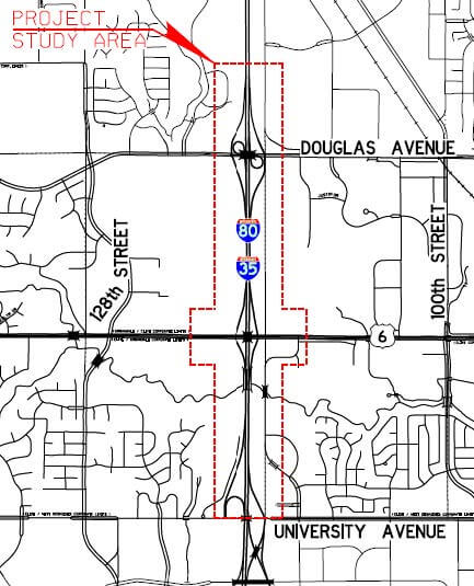 This situation prompted the Iowa DOT to explore improvements along a major thoroughfare — the U.S. Highway 6 (Hickman Road) corridor, stretching to the west from the Interstate 35/80 service interchange. Additionally, improvement alternatives to the I-35/80 service interchange ramps at Douglas and University Avenues — the interchanges to the north and south of U.S. 6 — were also studied. Since Interstate 35/80 and the affected interchanges are part of the Interstate Highway System, all modifications and improvements must first meet Federal Highway Administration (FHWA) criteria and gain approval.