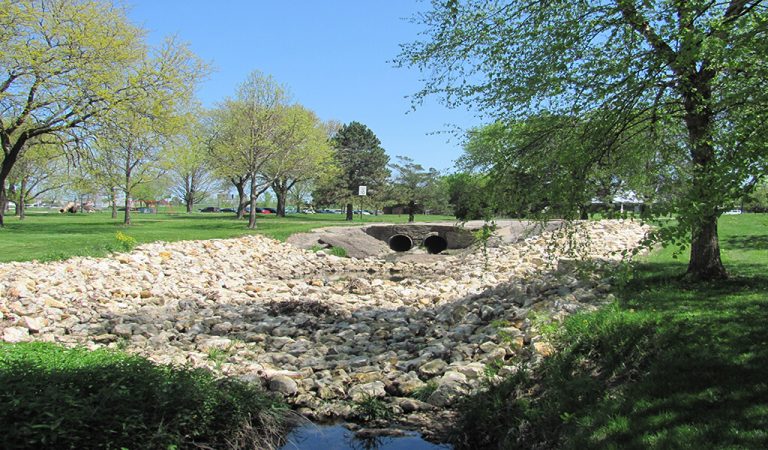 As part of the restoration design, the stream’s length was increased, and the channel slope was decreased by incorporating meanders into the stream. Energy dissipaters for culvert outlets and rock check dams were integrated into the stream channel design to reduce the channel slope further and reduce stream velocities. Native plants, forbs, and flowers were selected, along with native seed mixtures, to help naturally stabilize the channel. By stabilizing the banks in Noelridge Park, not only should the water quality be improved, but the entire public area’s biological health has also been enhanced.