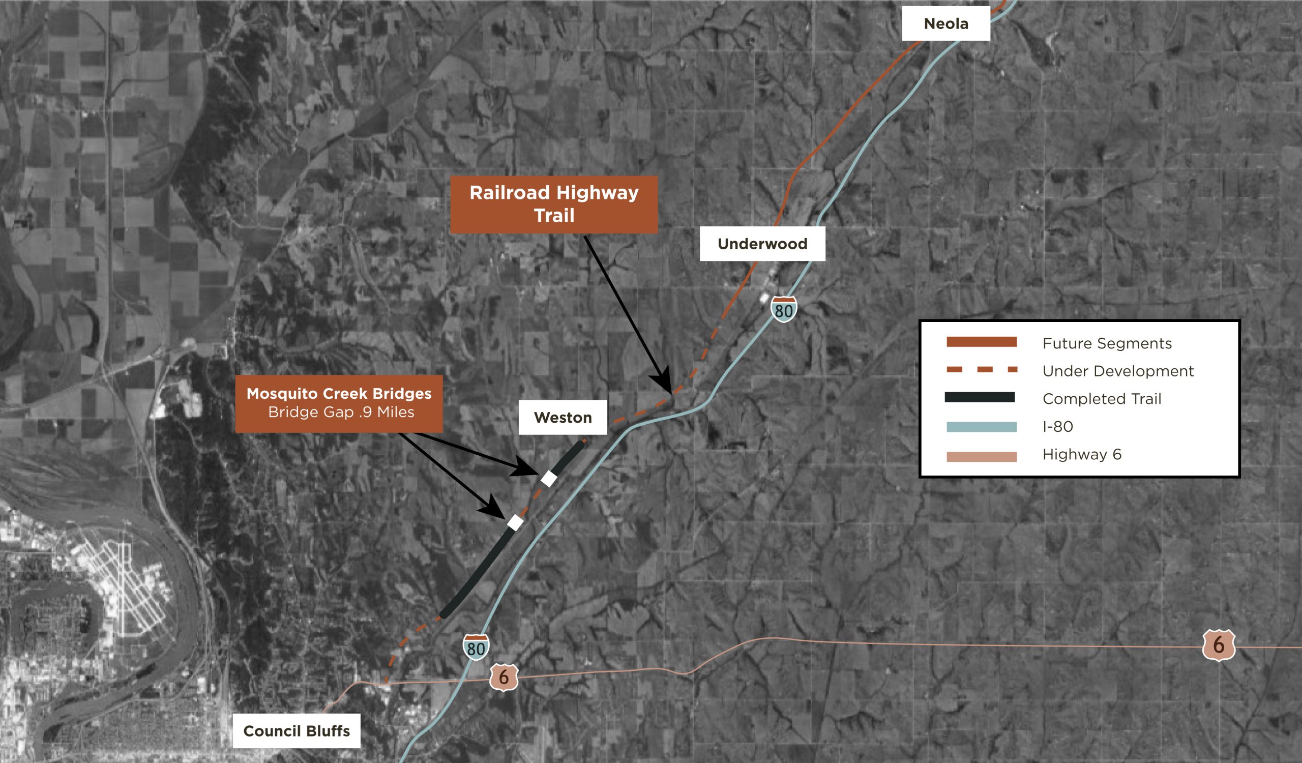 The southernmost segment of the trail from Council Bluffs to Underwood is currently (2022) being designed. Construction of this segment is slated for 2023 and 2024, followed by the final 6.3 miles of the trail from Underwood to Neola.