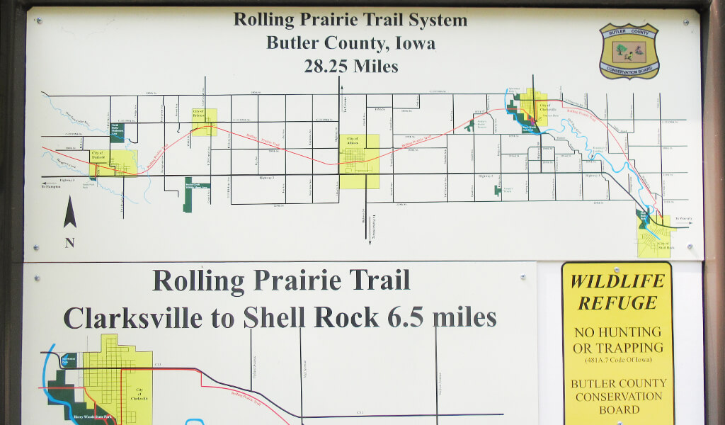 Today, the Allison to Bristow stretch of the Rolling Prairie Trail provides users with access to Wilder Park and restaurants, campsites, and restroom facilities on each end. Trail users experience a variety of landscapes and scenery along the trail, including native prairies, forested canopy, and updated historic railroad bridges. Other trail segments provide access to Wolter’s Prairie Preserve, Heery Woods State Park, and multiple bicycle fix-it stations for unexpected breakdowns. The easy grade of this hard surface trail and the convenient amenities make it a popular destination for outdoor enthusiasts of all ages.