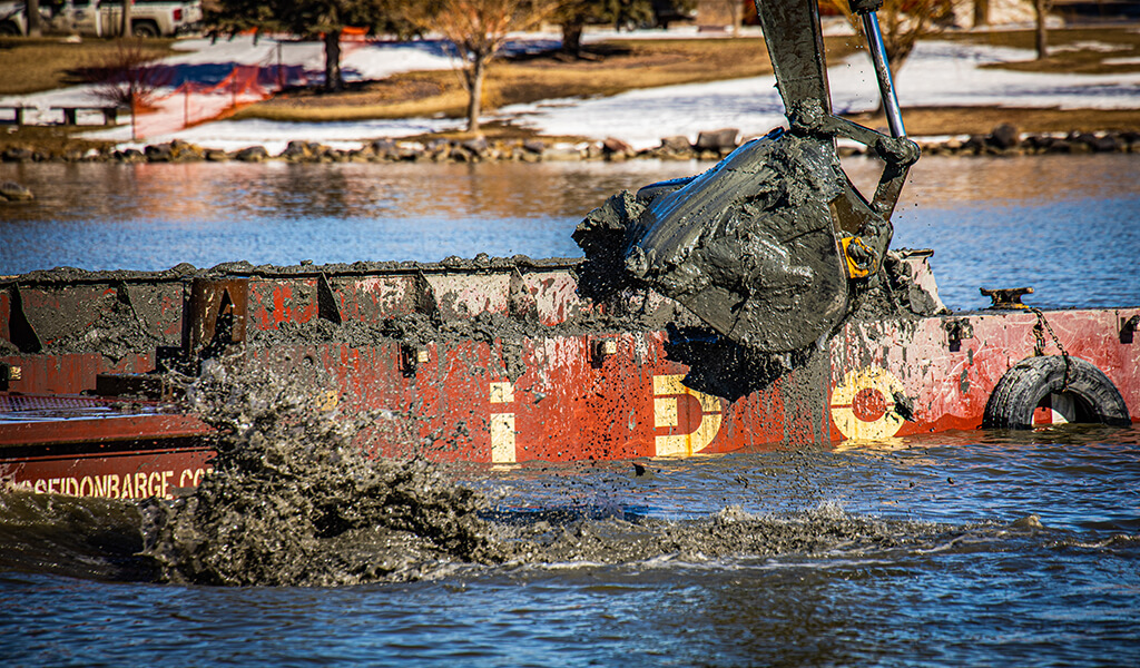 Once removed, the lakebed material was loaded into a hopper barge and transferred to dump trucks stationed in a specially designed loading area that had been set up with erosion controls. The sediment was taken to a locally permitted landfill, where it was contained for dewatering.