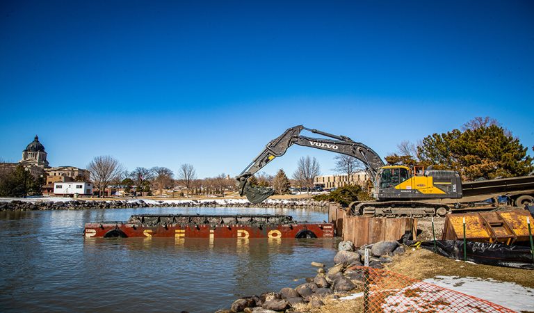 Dredging is also a disruptive process for wildlife. While migratory birds tend to avoid the site during construction, aquatic creatures do not have that luxury. The South Dakota Game, Fish, and Parks team performed a humane fish removal operation called electroshocking before active dredging operations began. Electroshocking fish is a common and effective method used in fishery management. This process directs a small electrical current through the water, stunning the fish so they can be quickly scooped up and removed. Electroshocking is a humane method to remove fish from a waterway and has little to no impact on the long-term health of the fish population. Once captured, the fish were relocated to several local waterways.