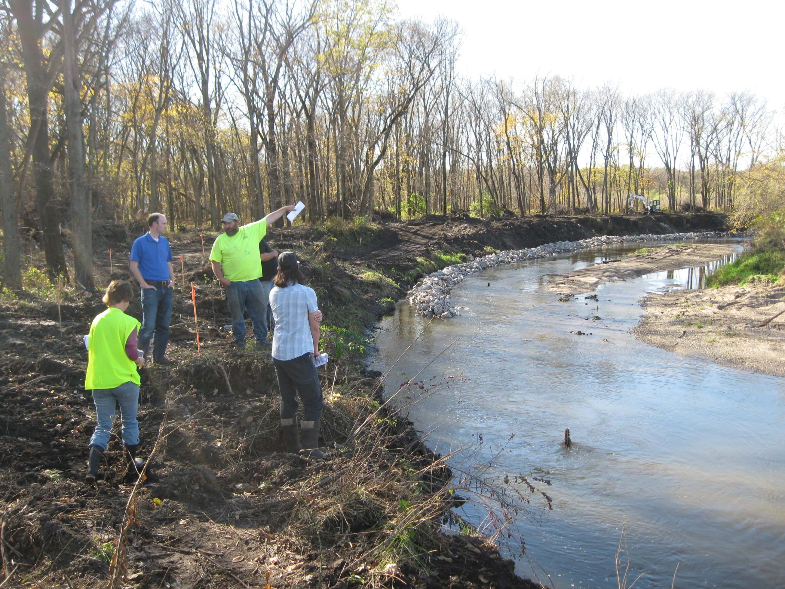 WMA members, local officials, landowners, and community staff review on-site work at Fourmile Creek.