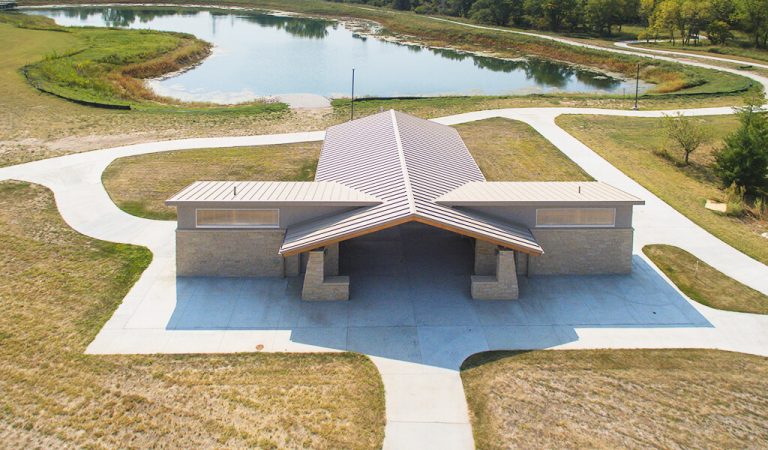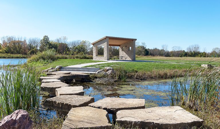 Phase three brought in most of the architectural elements, including the restroom shelter, lakeside shelter, civic shelter, stone crossings, and the overlooks, while phase four consisted of the addition of the fishing pier. Wrapping up the project in the fifth phase was the construction of the circular playground with five different ADA-accessible play experiences.