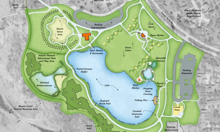 The park’s master plan development involved extensive public engagement efforts and numerous technical reviews to develop the desired park concept and plans. Foremost on the list of goals for the park location was the conversion of a 15-acre basin into an eight-acre recreational lake with a consistent pool elevation. This involved a thorough investigation and evaluation of the soil conditions at the site to ensure the safety of patrons, as well as the creation of a habitat that would support adequate fish stocking and native species protection and enhancement. Additionally, public input helped determine the importance of creating a regional park and the establishment of the park as a regional trailhead as critical components.