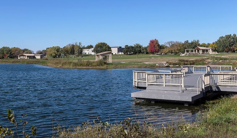 For further ease of accessibility, the park boasts over 220 parking stalls in two convenient locations, several multipurpose trail connections leading to regional trails to the south and west of the park, and an ADA-accessible fishing pier that puts anglers of all abilities right on the water’s edge. The use of large stones and a cascade water feature, along with numerous native plantings creates a pleasing and harmonious environment.