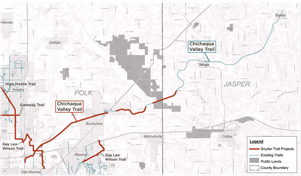Designed to accommodate bicyclists, runners, hikers, and cross-country skiers, the Chichaqua Valley Trail spans over 30 miles from Baxter to just south of the east mixmaster in Des Moines. Built almost entirely on a former railroad line, this expansive trail system is jointly managed by the Polk County and Jasper County Conservation Departments. The Snyder & Associates team has worked side-by-side with these organizations, and others, to create new and rehabilitate existing trail components over many years.