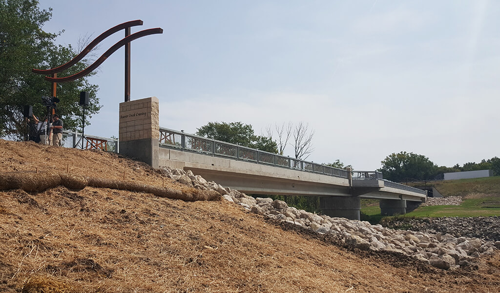 On both ends of the bridge are stone pillars built to resemble the welcome signs in nearby Johnston. These predominantly limestone structures have a nameplate on one side with “Beaver Creek Crossing” displayed. A structural steel “archway” at the bridge entrance provides a whimsical decorative feature.