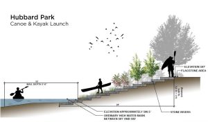 Hubbard Park in the Village of Shorewood is a local landmark in this Wisconsin community. Located on a nearly five-acre, 1,400-foot-long strip of land between the Milwaukee River and the former Chicago and Northwestern Railroad, the park contains the Hubbard Park Lodge and access to the Oak Leaf Trail. However, despite its location along the river, the park lacked easy access to the water’s edge for recreational watercraft. The Shorewood Public Works Department enlisted the services of the Snyder & Associates design team to develop a plan for a canoe and kayak launch that would give users of the park greater access to the Milwaukee River.