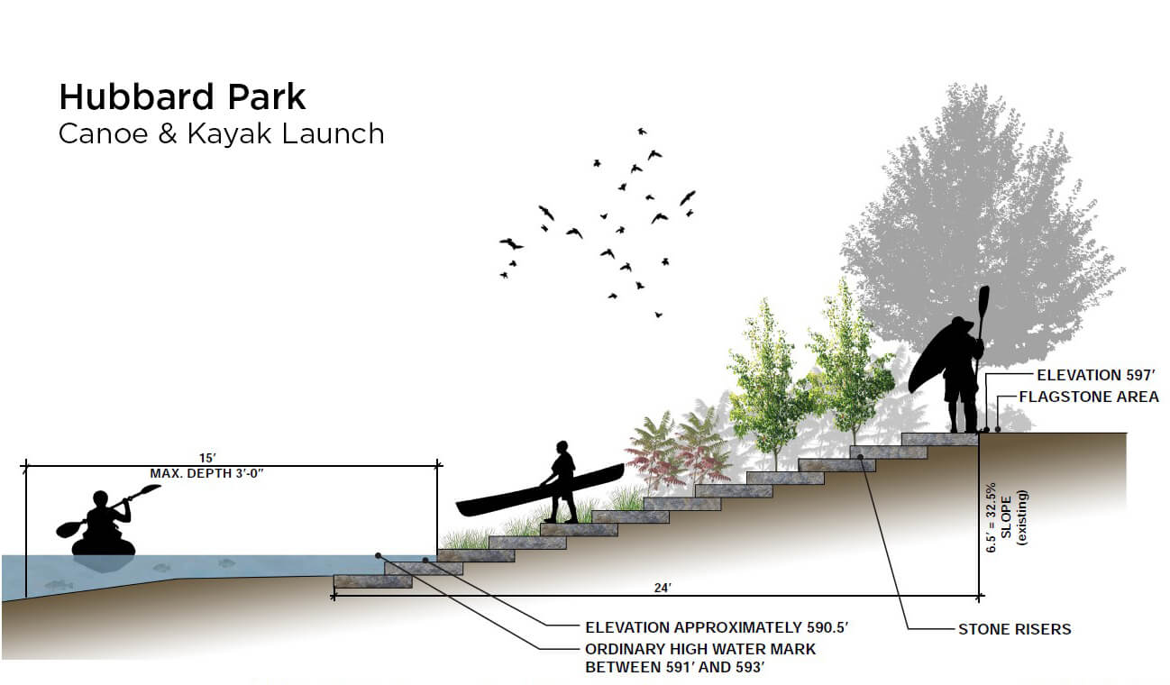 Following a graded path near the end of N. Morris Blvd. in Hubbard Park, the project area required approximately 35 cubic yards of earthwork grading, the installation of roughly 70 tons of outcrop stones and boulders, and the placement of approximately 16 pieces of snapped stone. With the canoe and kayak launch substantially completed, park users and recreational river enthusiasts now have a more convenient way to access the river that’s safe, aesthetically pleasing, and constructed with durability that will last for generations.