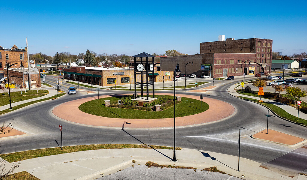 The Cross-Town Connector project focused on the realignment of Iowa Highway 926 through downtown Fort Dodge. This effort included the acquisition of blighted and abandoned downtown properties to “right-size” the core business district. Additionally, a continuous corridor was created to connect the west and east sides of town, allowing the downtown business district to serve the entire community better. The project included quality-of-life enhancements such as a civic plaza, bike lanes connected to the regional trail system, streetscape amenities, and specialty pavements. To streamline the operations of the local street network, two roundabout intersections were designed and built, and 13 traffic signals were removed. The overhead utility infrastructure was buried to improve the aesthetic appeal and provide better pedestrian accommodation.