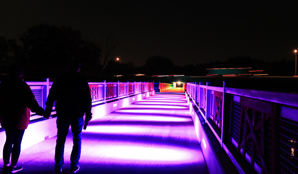 The final design for the new bridge is a much more solid structure that incorporates modern aesthetics with practical design applications. A customized LED lighting system is incorporated into the design and is unique to a structure of this type. It not only illuminates the bridge deck and approaching trail path but also the underside of the bridge. The lighting system can be programmed to change colors in a near-unlimited pattern, sequence, or timeframe, creating a one-of-kind visual attraction for trail users and vehicle traffic on nearby Interstate 80.