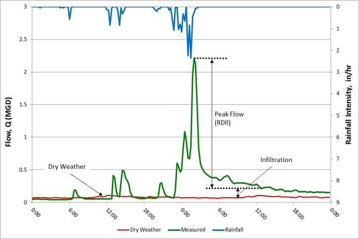This graphic of a hydrograph from a flow monitoring output. We’re typically using the graphical output to understand the data that is collected, and we will plot rainfall intensity at the top, which is shown in blue. We like to do intensity inches per hour versus, if you have a rainfall that occurs over an entire day, maybe you get three inches, but did two of that occur within an hour.